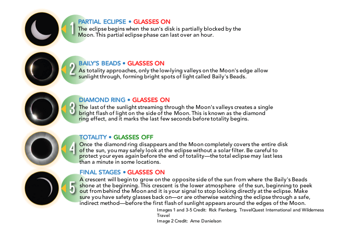 Of course, you must take extreme care to visualize the eclipse.  You must NEVER look at the sun without certified eye protection, except for the brief period of totality.  Do you remember the wild kid from your neighborhood growing up?  The kid who showed you how to burn bugs using his magnifying glass?  That same intense focusing power can occur in your eyes if you stare at the partial eclipse for any length of time.  It’s called Solar Maculopathy, and if you burn the most sensitive center of your retina, the damage can become  instantaneously permanent.  See the chart below on viewing the phases of the eclipse.
