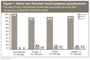 Distance visual acuity was comparable in the monofocal and Symfony groups. The Symfony groups had significantly better near and intermediate acuity. There were consistently low reports of visual symptoms: About 90% of subjects across both IOL groups reported no or only mild halos (Figure 1), more than 93% of subjects reported no or only mild glare, and more than 95% reported no or only mild starbursts.